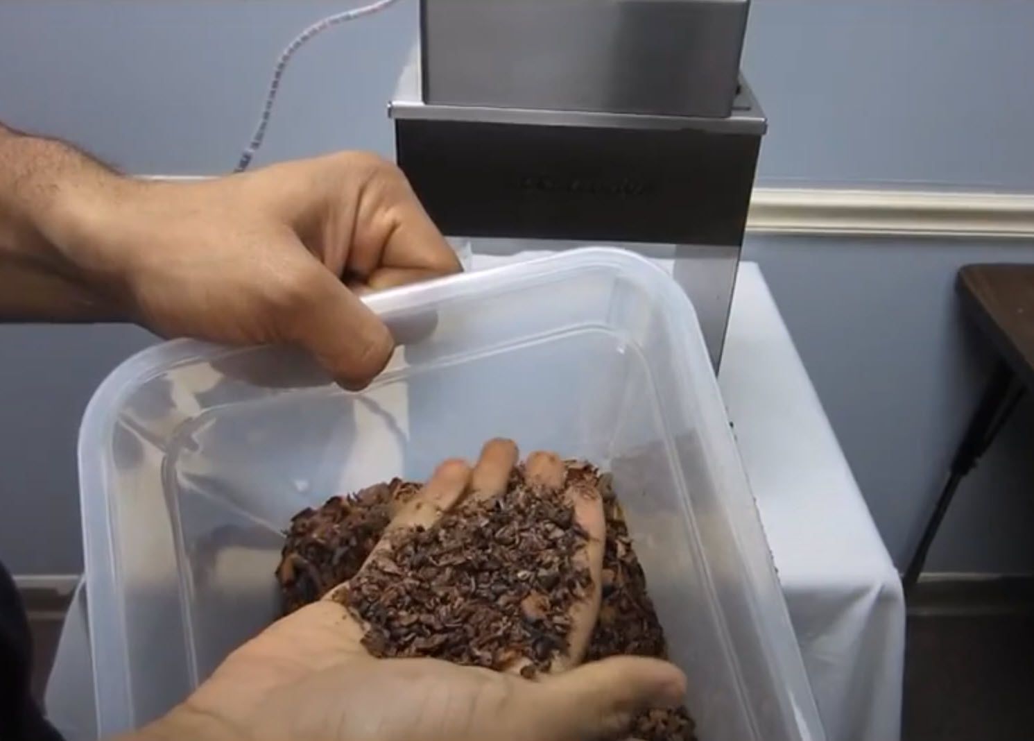 CocoaT manual Cracker is very compact with less than 1.5 sq. ft (0.15 sq. m) foot print. It can break 33 lbs (15Kgs) of cocoa beans (cacau beans, cacao beans) in one hour. The special, patented rollers in the cracker pull the shell loose from the nibs. The beans are also cracked into bigger pieces. Bigger nibs means easier winnowing and higher yield of nibs with less nibs in the husk and less husk with the nibs. Better quality, cleaner nibs generate higher profit to chocolate makers than cracking the cocoa beans in the regular crackers that crack the beans into smaller pieces. Smaller nibs make it harder to winnow which results in lower yield and/or lower quality nibs.