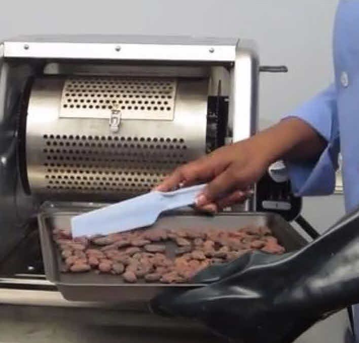 The next step is roasting, which drives away the moisture from the beans, develops the flavors and kills any bacteria that may be present. If you use a conventional oven, place the beans in a single layer and roast them according to the requirements of your recipe and beans. Make sure to stir the beans intermittently to ensure uniform heating. For small-scale operations, CocoaT roasters with rotating drums help ensure consistent results with minimum intervention. Roasting time varies from 20-45 minutes after the beans reach the 135C depending on the bean variety, origin and cocoa butter content. Roasted beans must be cooled immediately to stop the roasting process (this prevents over-roasting or burning of the beans).