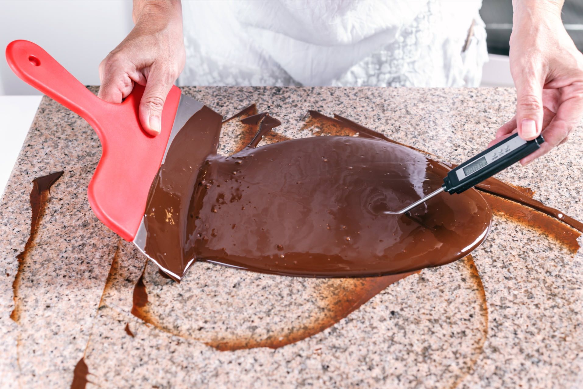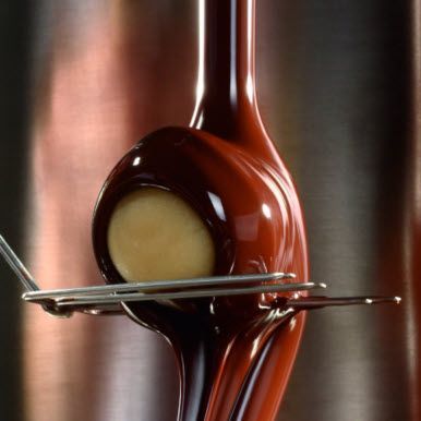 The next step is tempering the chocolate. This can be done with a tempering machine or by hand on a marble slab. Heat the melted chocolate to 110-117 F°, then slowly cool it to 88-90 F° by stirring in finely-chopped cold chocolate pieces. The process of heating and cooling should be repeated a few times. The tempering process creates the snap and shine that is expected in the finished chocolate. The temperature curve for tempering process varies with the type of chocolates made – White chocolate, dark chocolate, milk chocolate. One can also buy silk (tempered cocoa butter crystals) or make silk from cocoa butter and add it to the chocolate liquor to temper it. More sophisticated way of tempering is to use a tempering machine – batch tempering or continuous tempering machines depending on the volume of chocolates made and budget.