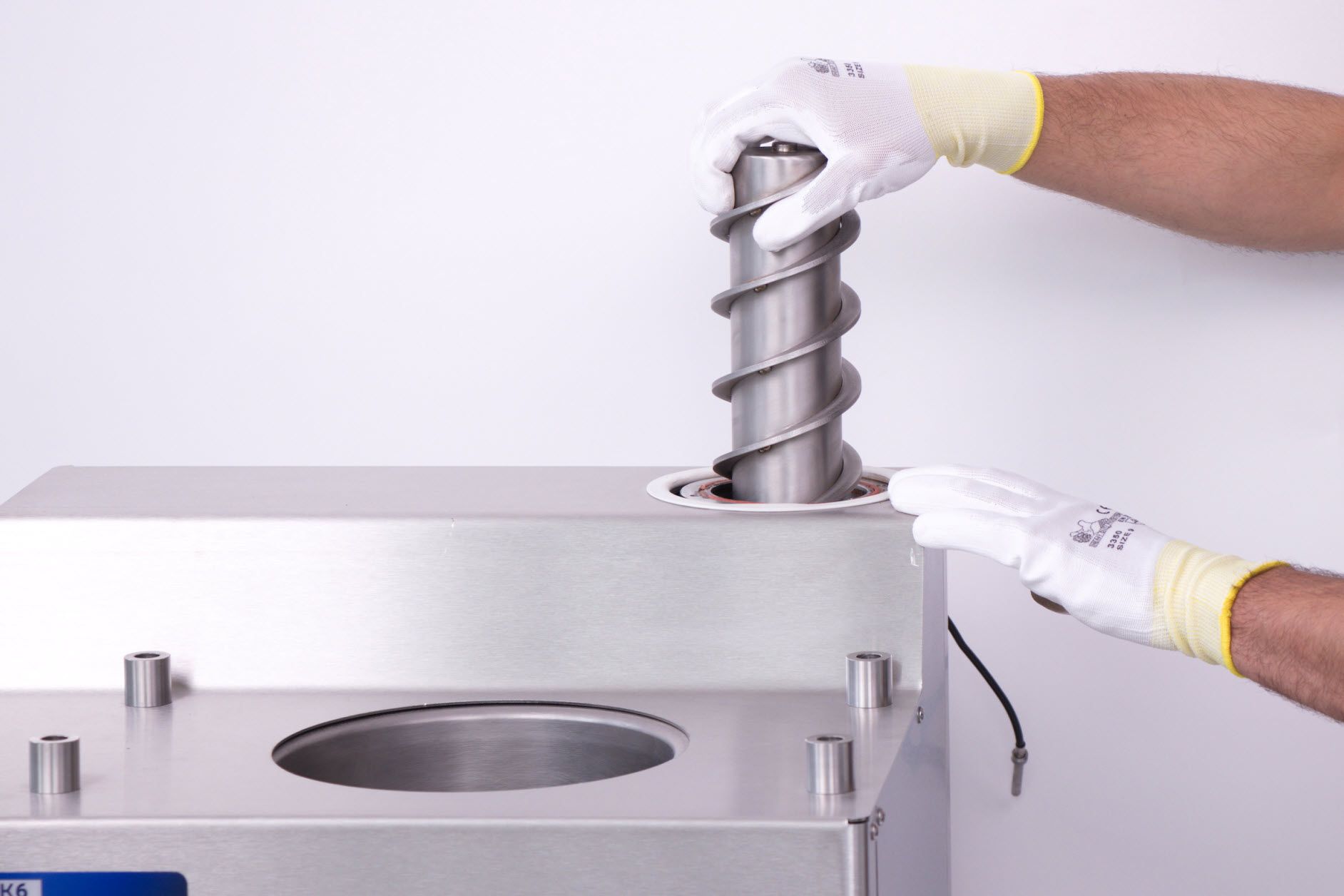 The ADAM K6 melts the chocolate and with the help of the cooling system it is then cooled to the processing temperature. The chocolate circulates constantly. Some of the crystals are dissolved again in the tank and everything is cooled again at the back of the auger area. This means you have freshly tempered chocolate at your disposal at all times!