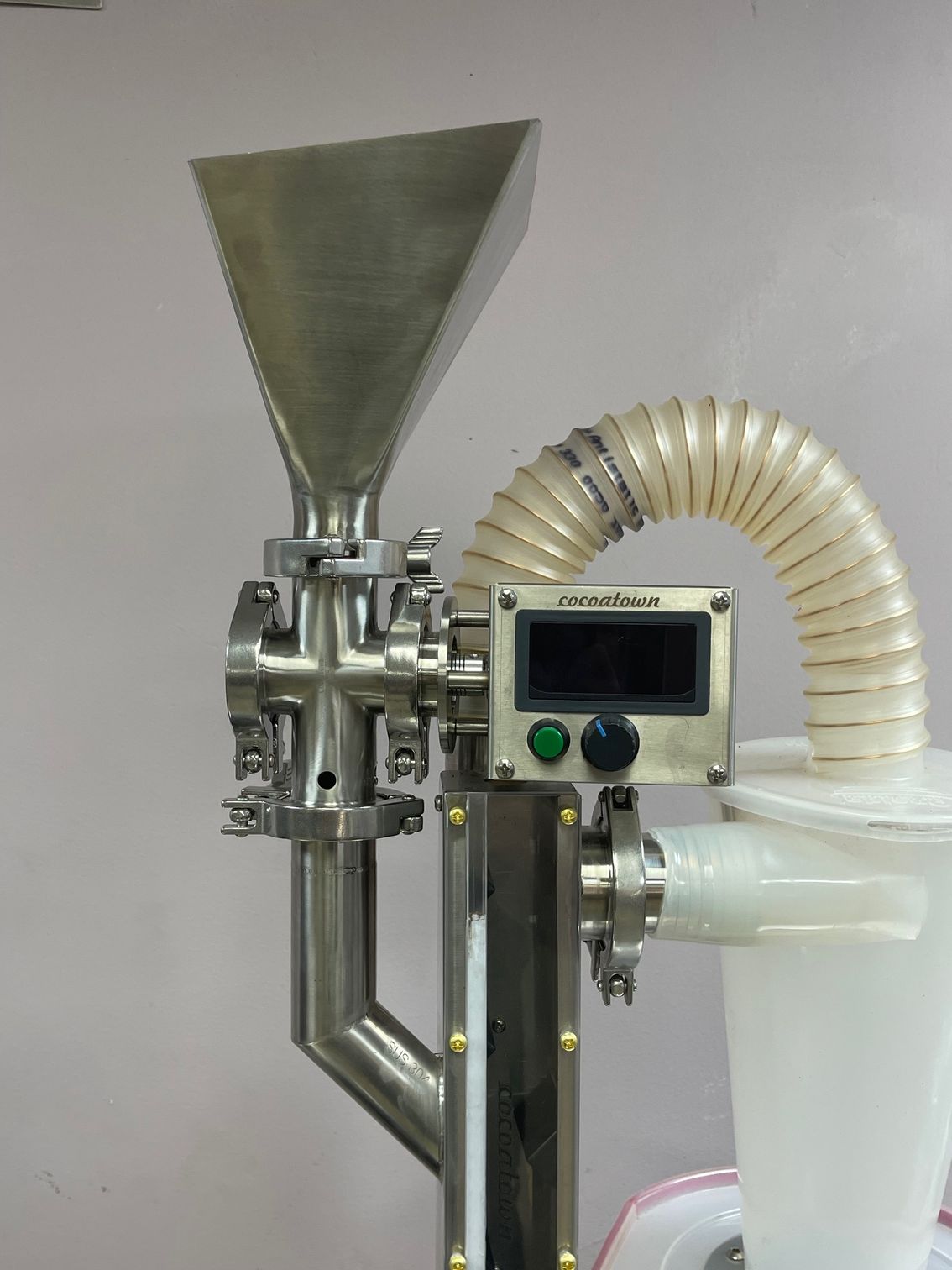 CocoaT deluxe Winnower is a compact system that efficiently separates the husk from the nibs in a single pass. The husk is collected in the collection box and there is no dust generated. It is hygienic and ideal for any manufacturing condition. The elegant stainless steel column can be displayed in front of the customers and they can see the separation process. The winnowing process is so efficient that the loss is less than 0.05%. This is the most cost effective, compact winnower you will find in the world. All food contact areas are made of high quality stainless steel.